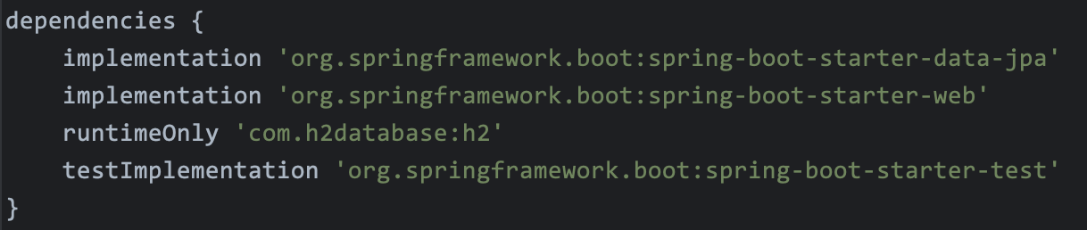 - runtimeOnly : 실행 시점에만 필요한 의존성을 나타냅니다. 최종 빌드되는 결과물에만 포함됩니다.