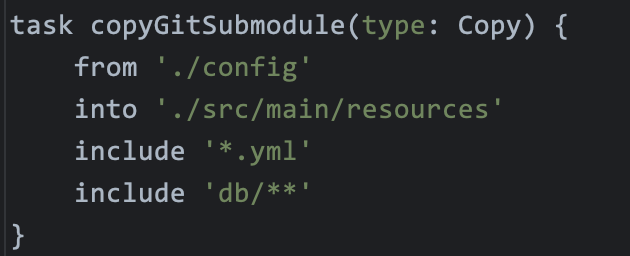 진행중인 프로젝트에서 사용하고 있는 submodule의 application.yml을 복사하는 task입니다.
