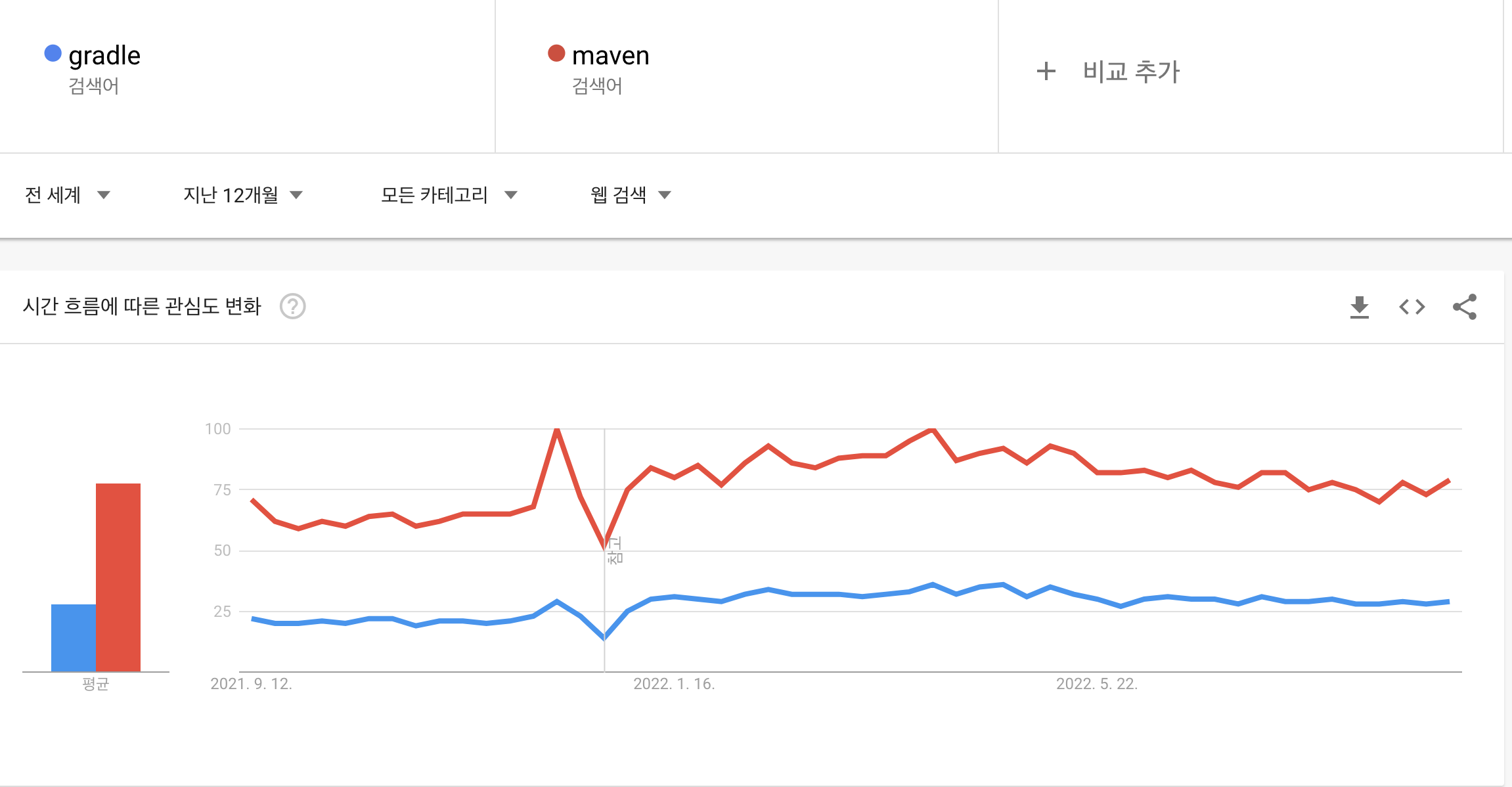 아직 점유율 자체는 Maven이 높지만 새롭게 만드는 프로젝트들은 대부분 Gradle로 작성된다고 합니다. 여러가지 이유들이 있겠지만 가장 큰 2가지 이유는 빌드속도와 작성/가독성의 차이 때문이라고 생각합니다.