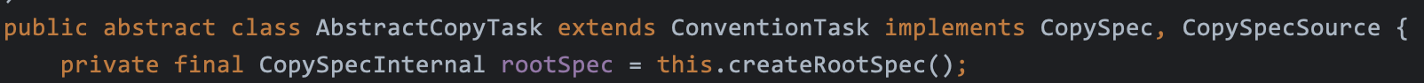 - AbstractCopyTask 추상 클래스를 보면 생성될 시 현재 구현체의 스펙을 생성하는 메서드를 호출합니다. (여기서 실제 구현체는 Copy 클래스입니다.)