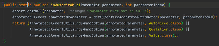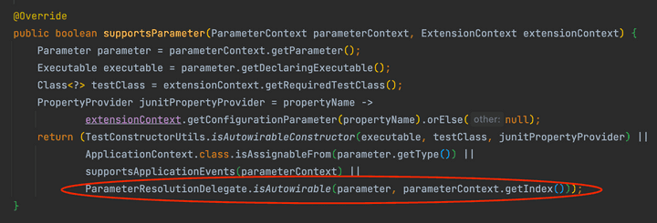 @SpringBootTest, @JdbcTest내부에는 @ExtendWith(SpringExtension.class)어노테이션이 등록되어 있으며, SpringExtension은 ParameterResolver를 구현한 구현체다. SpringExtension 클래스의 supportParameter 메서드에서는 스프링 컨테이너에서 가져올 수 있는 빈 타입 여부를 @AutoWired 어노테이션이 있는지를 가지고 판단한다.