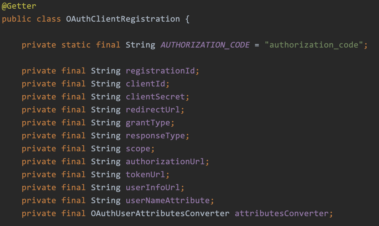 저장소를 만들었으니 이제는 실제 구성정보를 담는 객체를 추상화해야 합니다. OAuthClientRegistration 클래스를 작성하였고, 해당 클래스는 2가지 클래스를 조합하여 만들기로 결정했습니다.