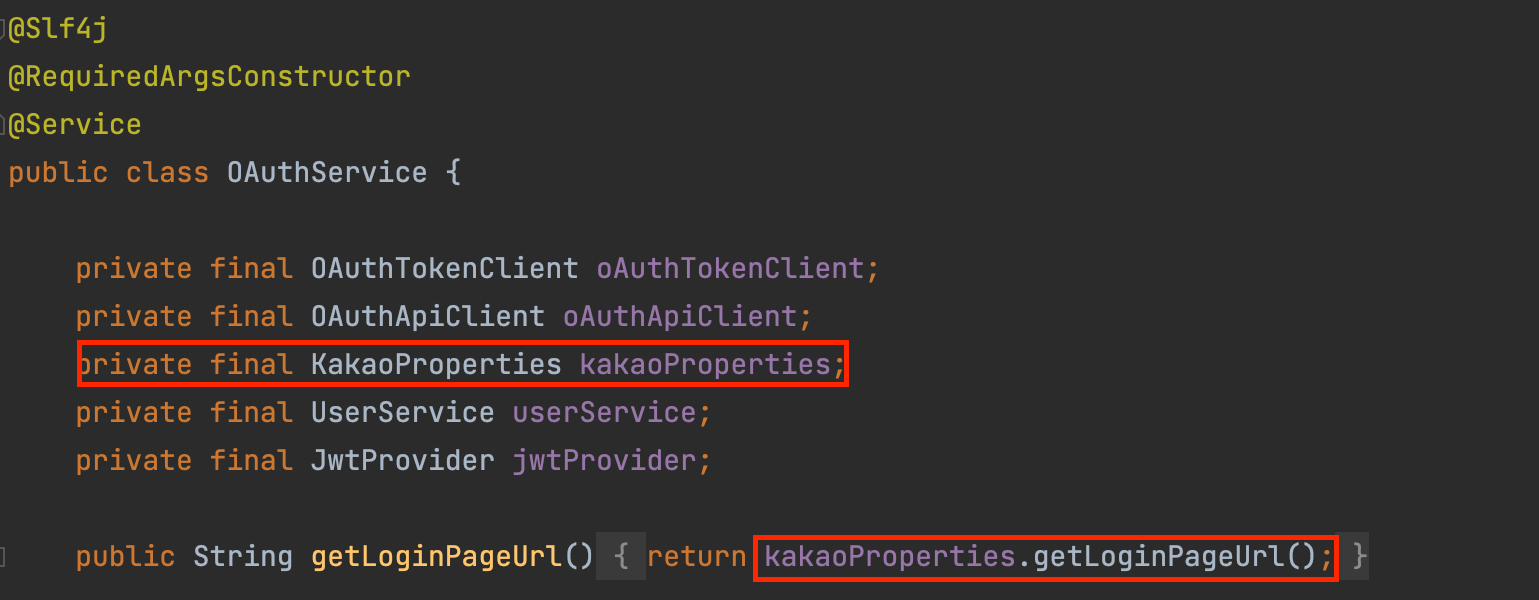 기존의 서비스 코드에서는 카카오api 사용에 필요한 정보를 담은 KakaoProperties 클래스를 직접 주입받아서 사용하고 있었습니다. 즉, 새로운 플랫폼을 지원할때마다 주입받아야하는 클래스가 늘어나야 했으며 요청 형태에 따라 조건문으로 구별해서 사용해야 했습니다.