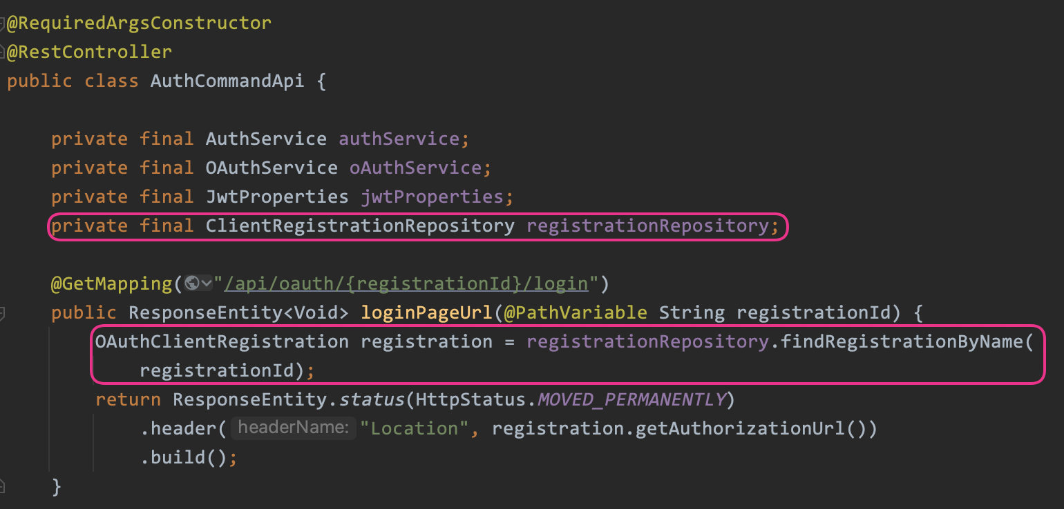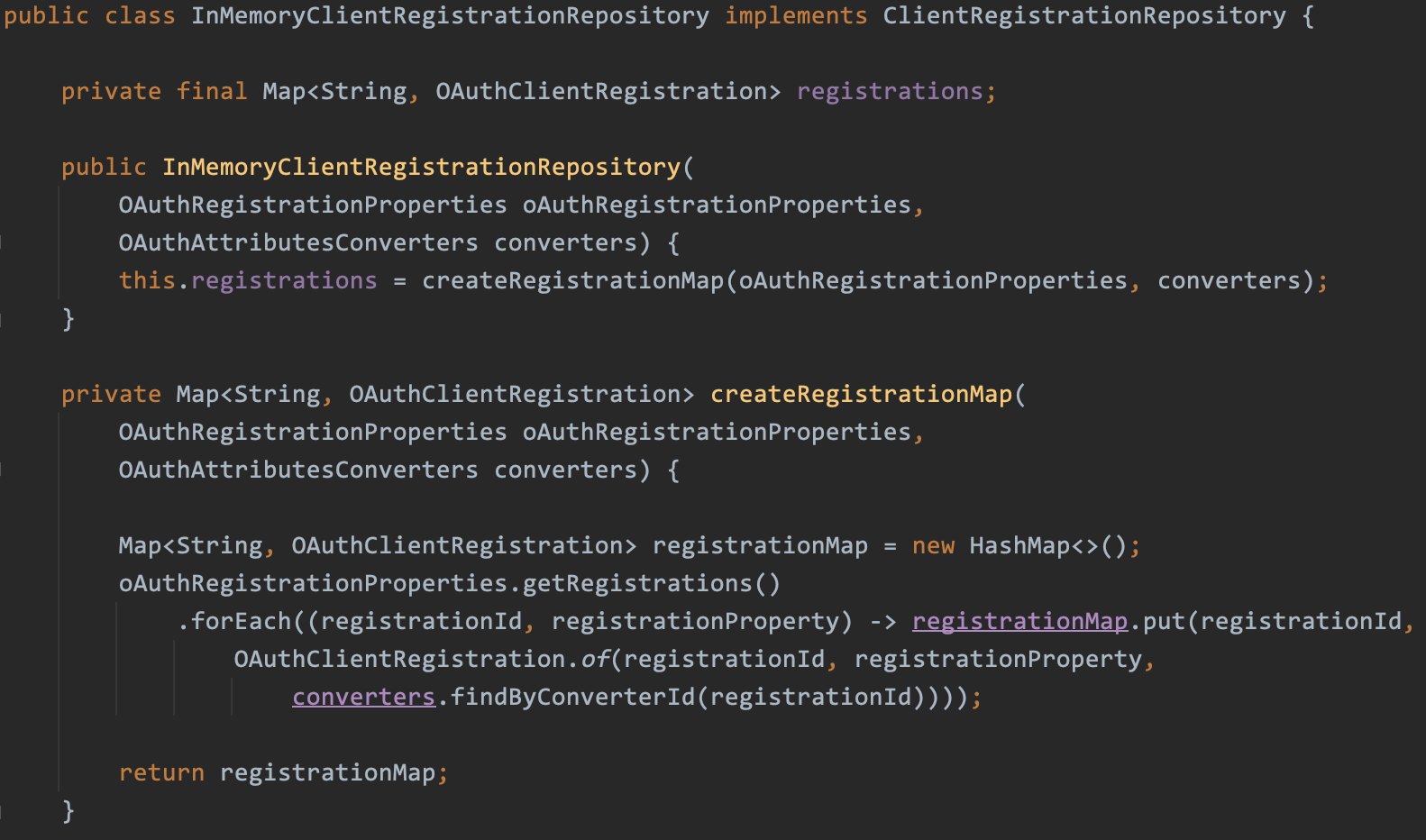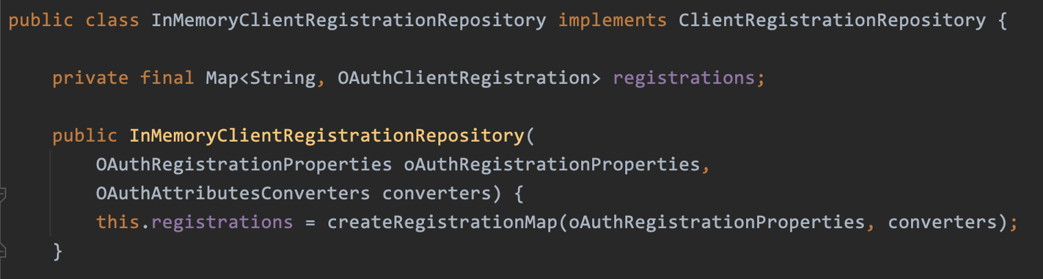 이를 개선하기 위해 SpringSecurity의 InMemoryClientRegistrationRepository 클래스를 참고하여 저희 서비스에서 사용할 InMemoryClientRegistrationRepository 를 직접 작성했습니다. (해당 내용이 궁금하다면 이전 글을 참고해주세요.)