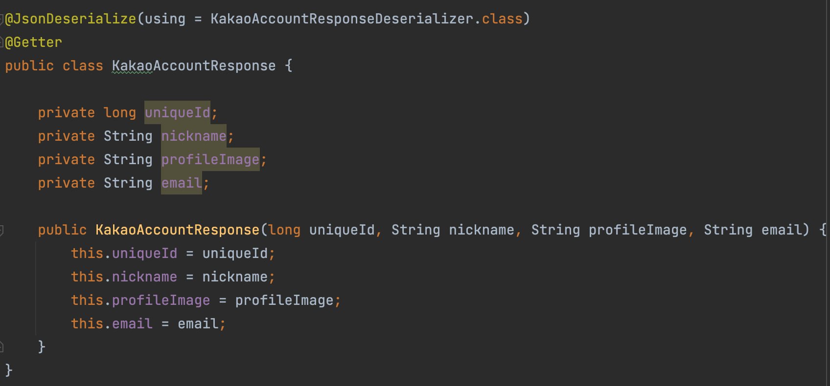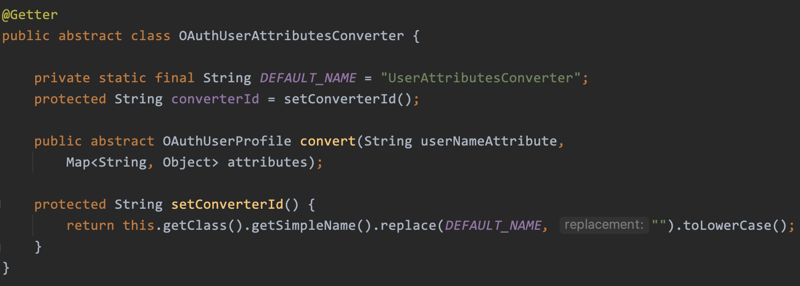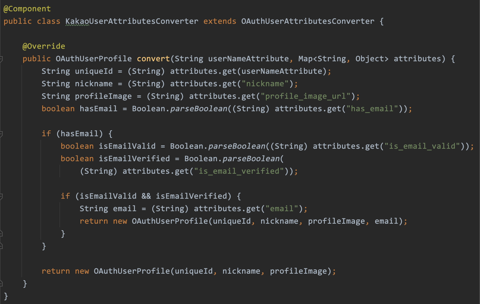 플랫폼별로 유저정보의 응답형태가 조금씩 다릅니다. 예를들어 카카오는 유저 이름이 nickname이라는 필드로 제공되는 반면, google의 경우 name으로 제공됩니다. 이렇게 조금씩 다른 응답을 공통된 형태의 응답객체로 사용하고 싶었습니다. 이를 위해 해당 플랫폼에 맞는 Converter를 그때그때 직접 구현하기로 결정하였습니다.