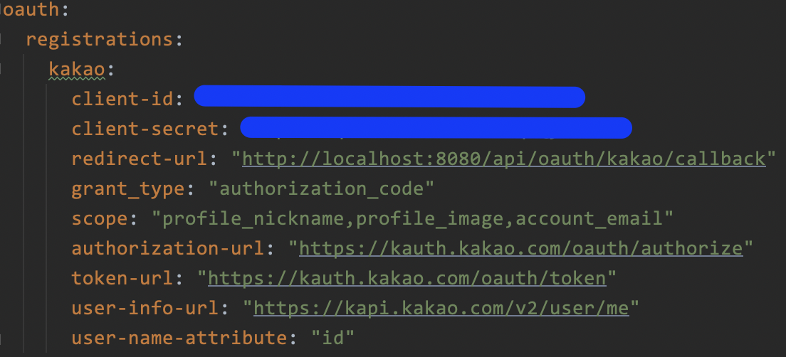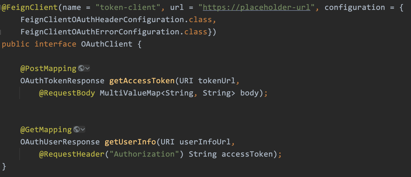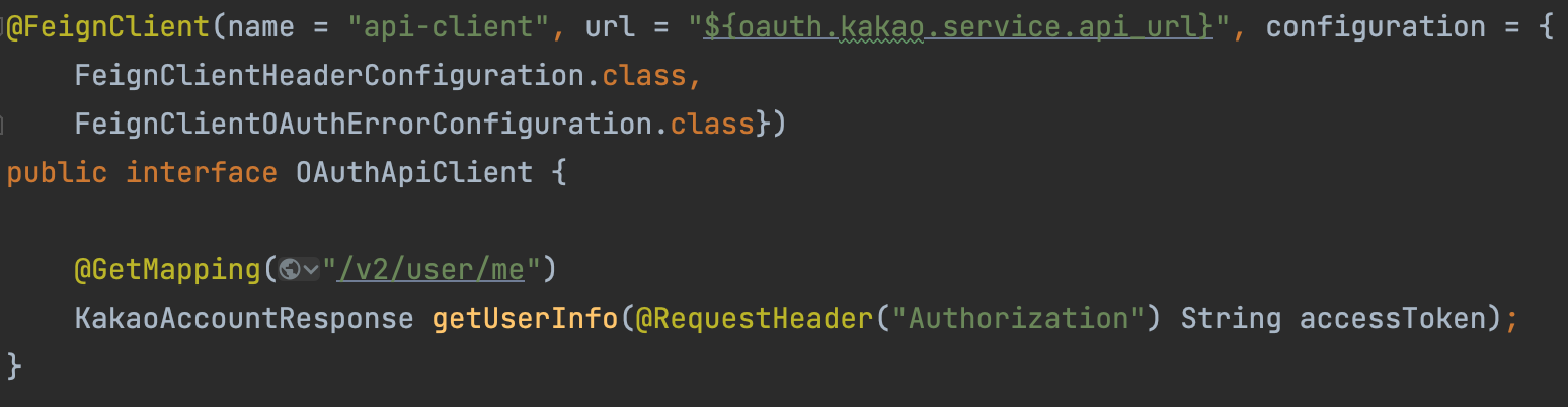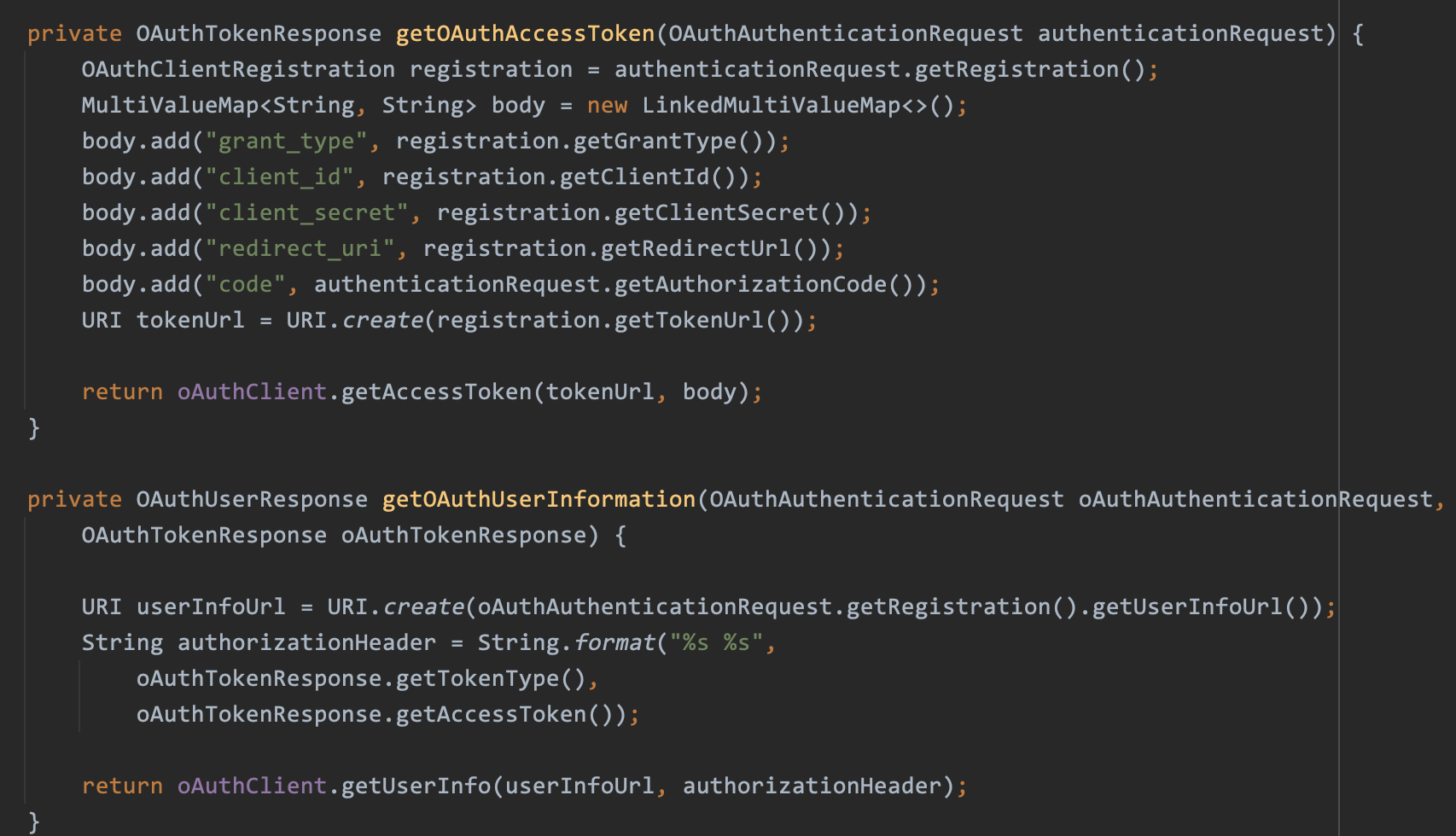 필수적으로 필요한 정보를 registration으로부터 꺼내 body에 담아 요청합니다. - getOAuthUserInformation: 유저의 정보를 요청하는 메서드입니다.