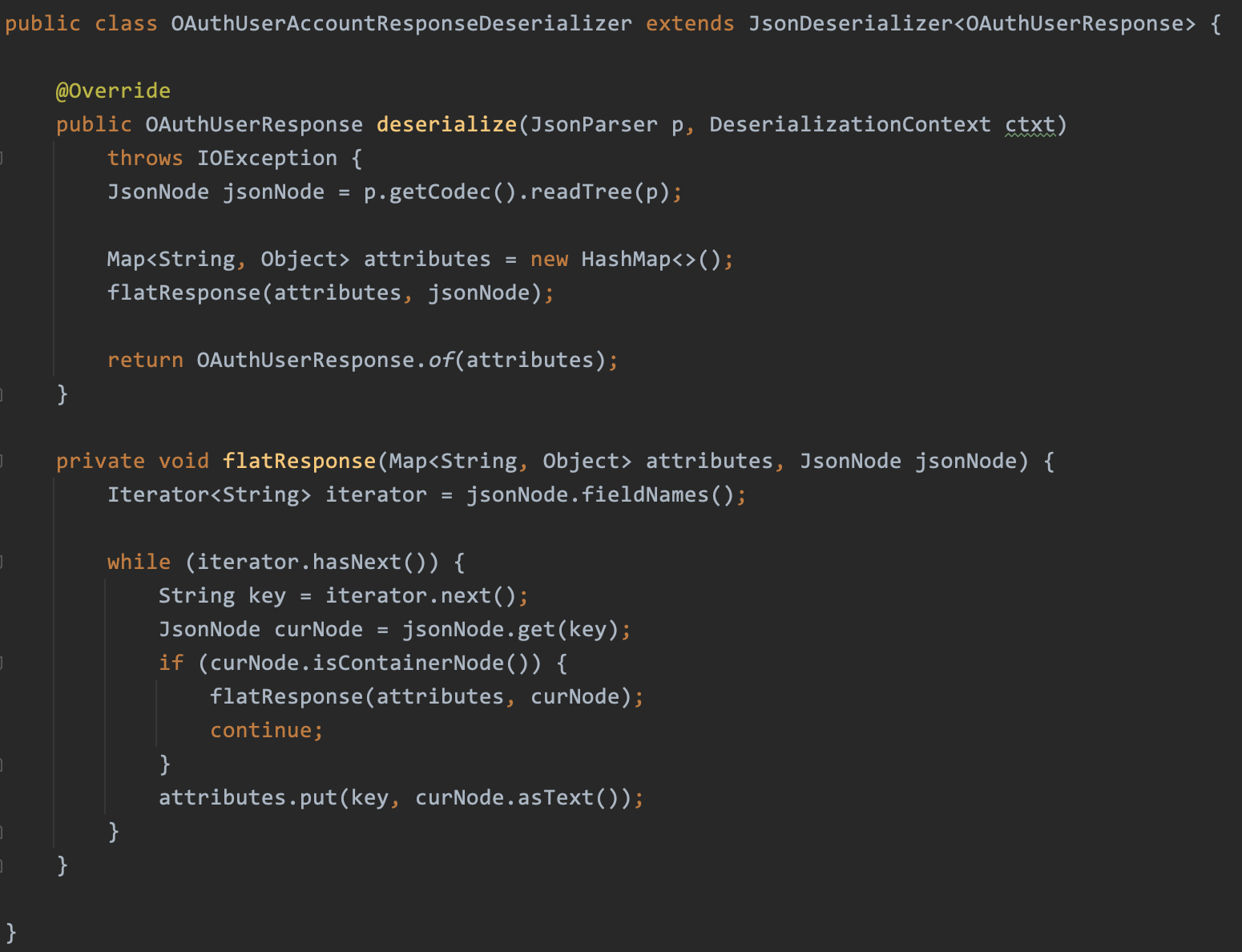 (이때 kakao의 경우 응답 json의 depth가 2~3까지 들어가는 반면 github은 1입니다. 이 정보들을 평탄화하여 map에 저장하는 작업을 FeignClient Deserializer에서 합니다.)
